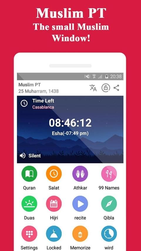 Muslim pt: the small Muslim window: A simple app, containing a set of characteristics that are considered the pillar of Islam like: azan alarm & accurate prayer time, Islamic Hijri calendar, tasbih counter dhikr allah, the holy quran with translations and audio recitations, Qibla locator with map + dua.