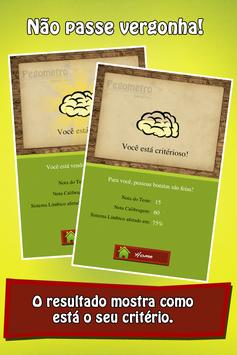 Quando você sair com seus amigos e estiver de olho em alguém, abra seu Pegometro e inicie o teste, 15 das 30 fotos serão apresentadas de maneira aleatória, ao finalizar a votação o aplicativo calcula seu resultado e baseado em estatísticas lhe informa o quanto seu sistema límbico está afetado. Assim saberá se está sóbrio e se a pessoa que você está apaixonado é realmente bonita.
