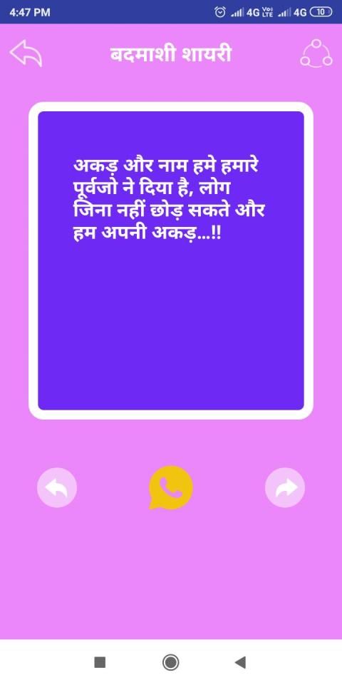 Aplikasi ini berisi semua jenis Badmashi Shayari Hindi & Badmashi Status Hindi di kedua hindi & Inggris.