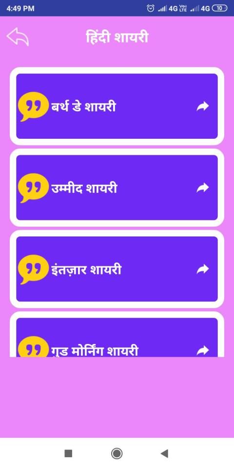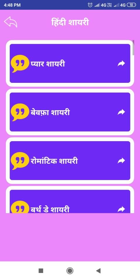 This app also cantains Birthday Shayari Hindi, New year greetings Hindi, Eid Mubarak Hindi, christmas wishes, Diwali shayari, Wedding anniversary wishes etc.