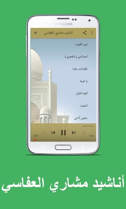 تطبيقنا هو تطبيق أناشيد مشاري العفاسي حيث يحتوي على جميع أناشيد الشيخ مشاري العفاسي وهو مشاري بن راشد بن غريب بن محمد بن راشد العفاسي المطيري وهو خطيب و إمام للمسجد الكبير في الكويت وهو كويتي الجنسية , ويعد مشاري العفاسي من الأشخاص القليلين جداً الذين يقومون بقراءة القرآن الكريم وبإلقاء الأناشيد .