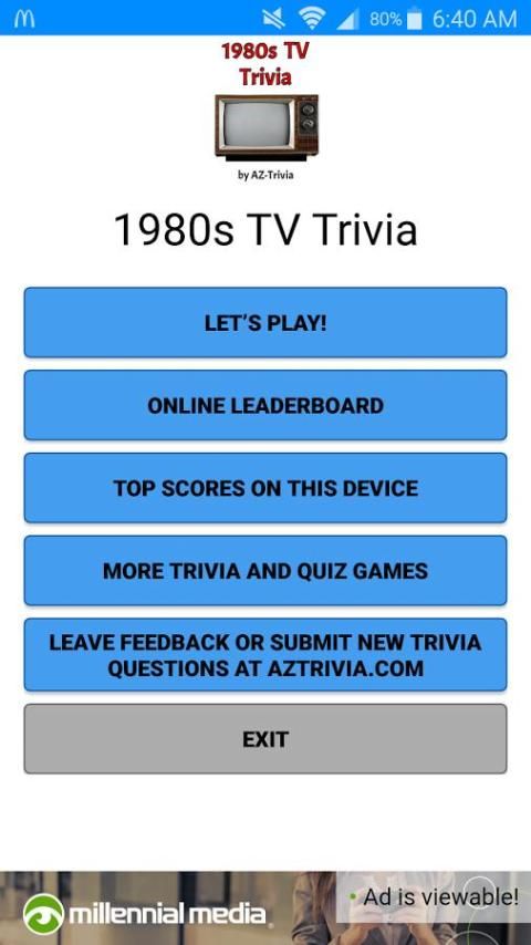 1980 TV Trivia kuis permainan akan menantang pengetahuan Anda tentang televisi klasik menunjukkan dari tahun 80-an. Knight Rider, Family Ties, dan A-Team - itu semua dibahas di sini! Permainan memiliki 5 modus yang berbeda, dan masing-masing memiliki leaderboard sehingga Anda dapat melacak top skor Anda dan melihat bagaimana mereka dibandingkan dengan orang lain. Periksa banyak permainan trivia lebih diciptakan oleh AZ Trivia.