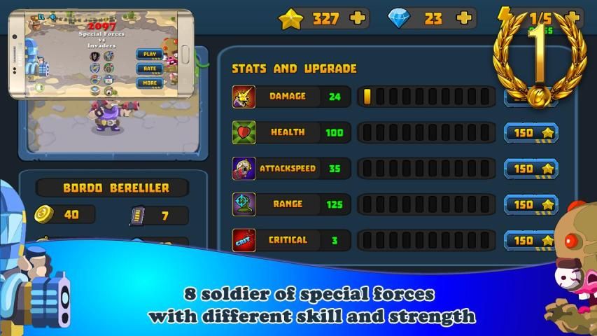 ✯ Pasukan Khusus memiliki elit dan prajurit gagah berani. Setiap prajurit memiliki skill dan kekuatan yang berbeda, merupakan tim yang kuat dapat mengalahkan segalanya. Jadi sekarang, mari kita menuntun Anda Pasukan Khusus untuk membunuh para penjajah dan menyelamatkan kota. Selain itu, Anda juga memiliki keterampilan yang berbeda untuk membantu Anda banyak dalam mengalahkan Angkatan. Sangat menyenangkan bahwa Anda dapat menggunakan emas Anda, permata untuk meng-upgrade tentara Anda, keterampilan untuk mendapatkan kekuatan yang paling mengerikan.