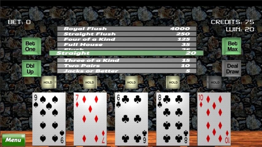 Jika Anda menyukai video poker, Anda akan suka bermain 3D Video poker di ponsel atau tablet. Kami memiliki empat pertandingan paling populer termasuk: