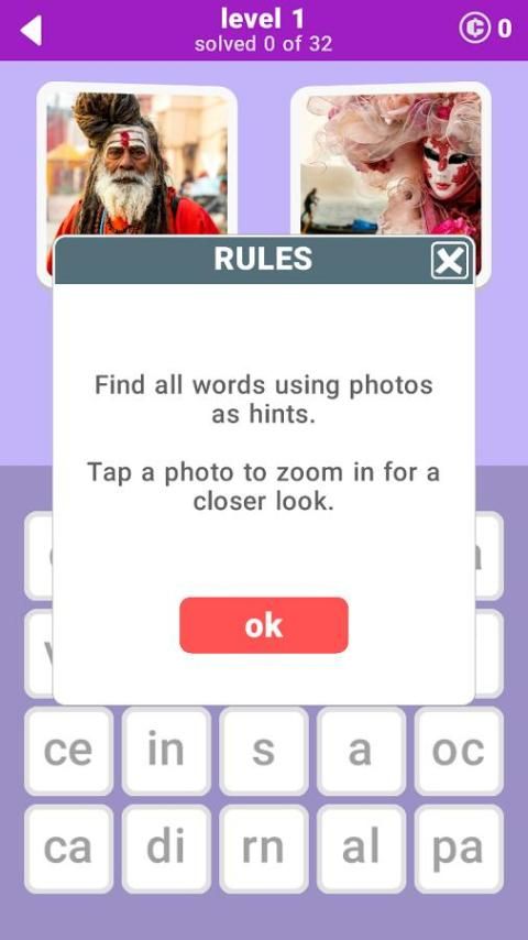 Dua kata per foto. 32 kata per tingkat. 640 kata dalam permainan. Anda dapat menemukan semua dari mereka? Kadang-kadang Anda harus berpikir di luar jelas. Semoga berhasil!