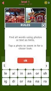 Satu kata per foto. 27 kata per tingkat. 648 kata dalam permainan. Anda dapat menemukan semua dari mereka? Kadang-kadang Anda harus berpikir di luar jelas. Semoga berhasil!