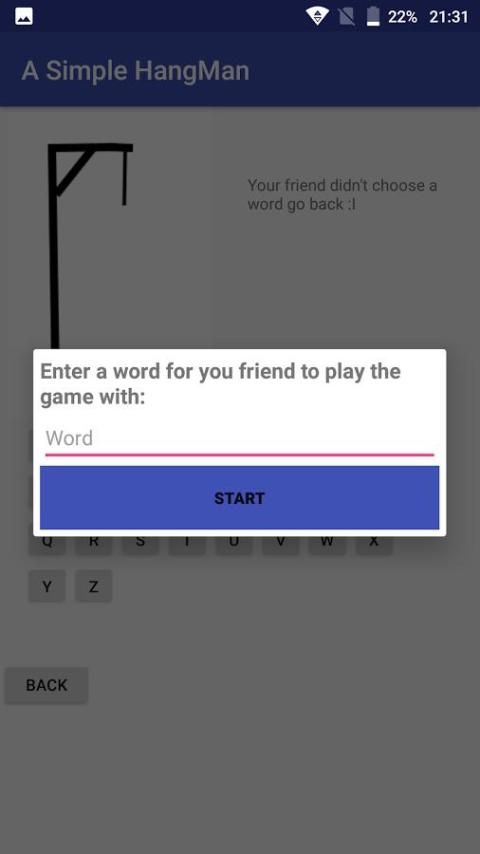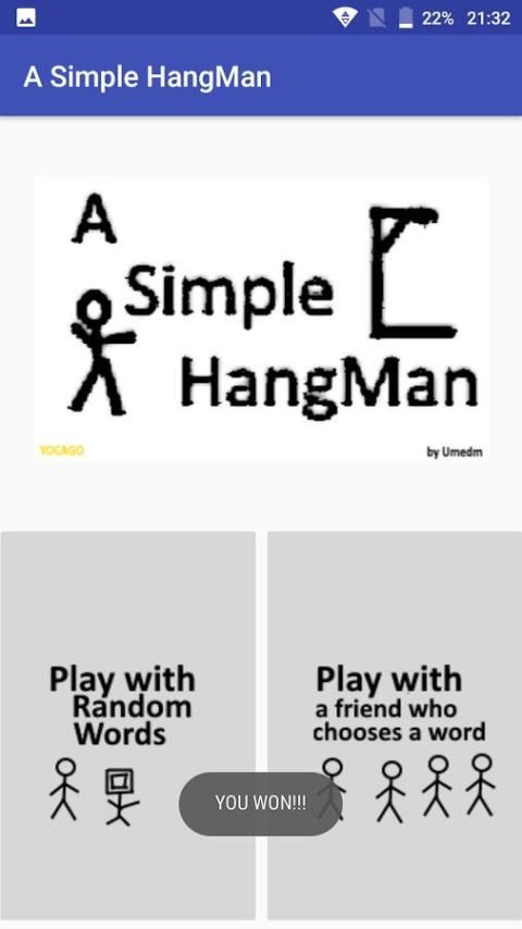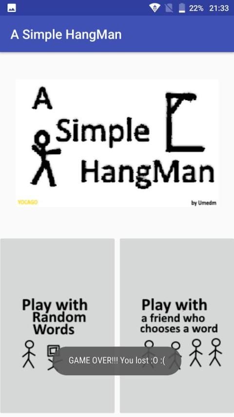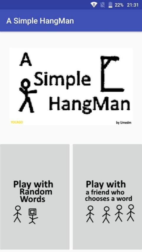 Sebuah Hangman Sederhana. Anda dapat bermain dengan kata-kata acak atau membiarkan teman memasukkan kata kemudian bermain.