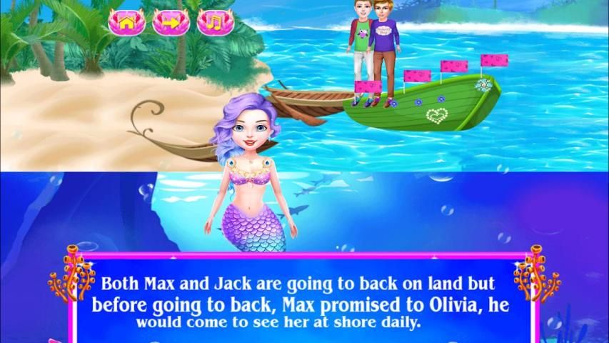 After waiting for many days when there was no sign on Max’s visit, Olivia thinks of visiting him herself, In this matter she asks ocean friend for the help, her friend agrees to help Olivia, but she warns her that to go to the land , by getting legs she will lost her sweet voice ,Olivia agrees for the deal,friend gives her the process to make magical drink, after drinking that Olivia would get legs and her tail disappear.Thus by making and drinking that drink Olivia gets new legs so that she could go to Max’s land to tell him that she missed him.