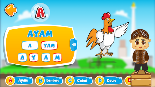 Pada pemainan ini anak-anak akan belajar mengenal huruf alfabet A sampai Z. Konsep pembelajaran pada aplikasi ini dirancang secara interaktif disertai permainan menarik dan suara yang menarik sehingga anak-anak tidak bosan saat bermain.