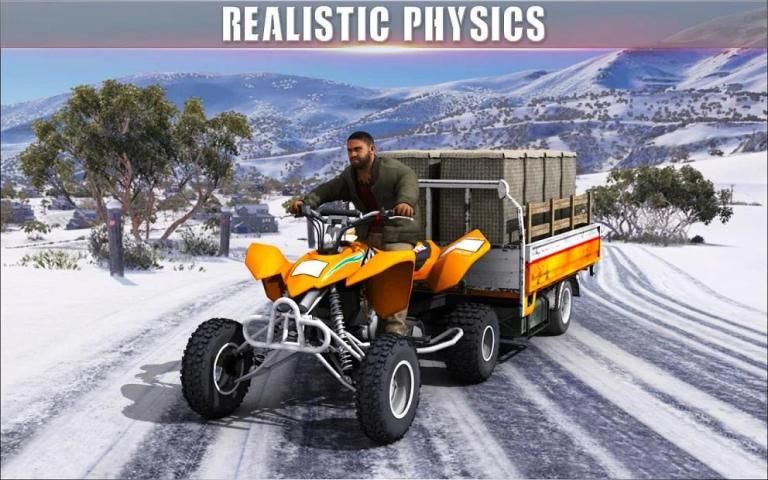 Game environment is specially designed for quad bike riders to enjoy real ATV riding in snowy mountain roads. Cargo transportation on trolley is a hard task and big responsibility. Get your helmet on for safety and drive 4x4 ATV bike to deliver cargo through off-road tracks. Avoid fast speed because you’re loaded with heavy cargo, so drive carefully and accurately to reach at the given destination. It’s time to prove you as a real quad bike rider on extreme off-road snowy terrains. Slow down while taking sharp turns to avoid accidents. Enjoy ATV driving simulator on snowy mountains and feel the real excitement and adventure