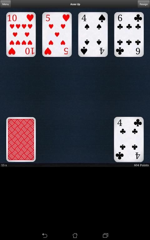 Dalam solitaire yang Aces Up kartu dibagikan empat pada satu waktu untuk empat tumpukan kartu yang berbeda. Setelah kesepakatan Anda harus mencoba untuk menghilangkan kartu sebanyak mungkin dari empat tumpukan. Sebuah kartu dapat dihilangkan dari tumpukan jika kartu teratas di salah satu tumpukan lainnya adalah dari jenis yang sama dan memiliki nilai yang lebih tinggi. Bila tidak ada lagi kartu dapat dihilangkan, Anda berurusan empat kartu lebih dari dek untuk melanjutkan penghapusan. Anda harus di Aces Up bertujuan menghilangkan segala sesuatu kecuali ace dalam waktu sesingkat mungkin dan dengan sedikit tindakan yang dilakukan mungkin. Apakah Anda siap untuk ace itu?