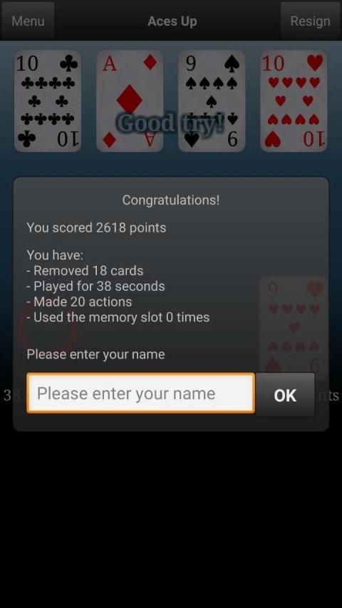 This version of Aces Up has an optional small feature: you may use a temporary card slot two times in order to increase your chances of successfully finishing the game. The feature can be turned on and off from options. Use it wisely.