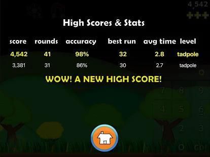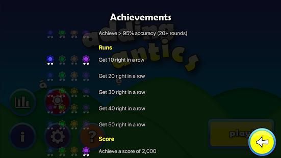 Add the numbers before they disappear! Adding Antics is a fun game to practice mental addition skills. Four levels of play (Tadpole, Greenie, Whiz or Guru), each of which gradually increase in difficulty, will challenge players of all ages and skill levels. But don't worry! Special items (Bomb, Time Freeze, and Magnet Merge) can help out when time is running short. Once you've been pushed to your limit (it happens to us all!) you will be given a summary of how well you did (longest running streak, problems solved, average completion time and percentage answered correctly). Achievements challenge you to hone your speed, accuracy, and gaming skills at every level! Doing math has never been so fun!