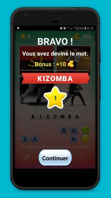 Prinsipnya adalah: setiap tingkat terdiri dari 4 gambar dan huruf untuk membentuk kata sehubungan dengan 4 gambar. Jika Anda menemukan solusi, Anda maju ke tingkat berikutnya. Jika tingkat terlalu keras, Anda dapat menggunakan kamar yang tersedia atau dikombinasikan untuk mengungkapkan huruf dan memecahkan teka-teki tersebut.