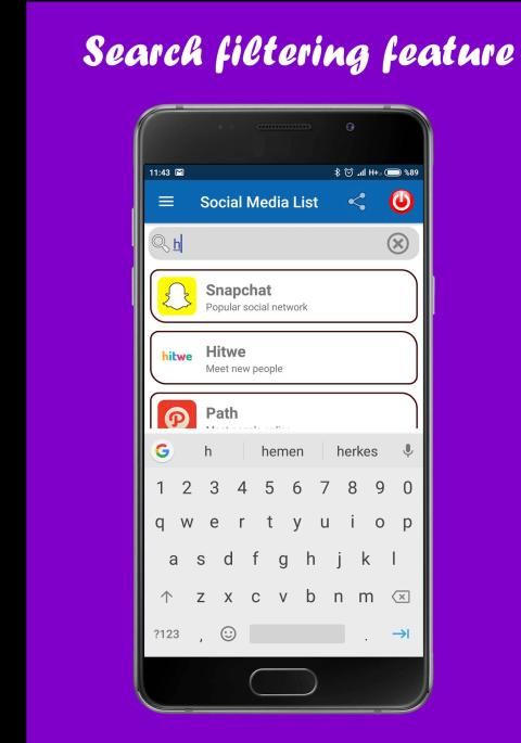 Aplikasi ini berisi semua situs jejaring sosial terkenal seperti Facebook, Twitter, Instagram, Snapchat, dan Pinterest.