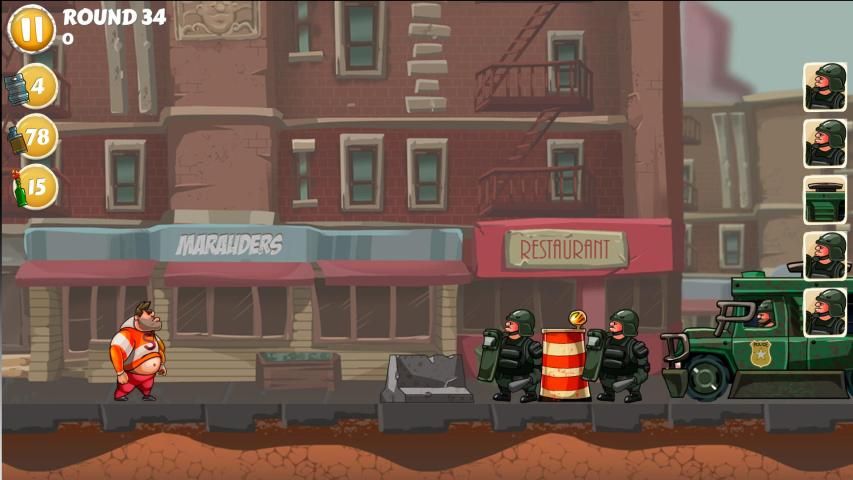 Now, needless to say Ogre’s friends are pissed (in every sense of the word.) Not only are they drunk, now they’re angry. So, naturally, they have to get him out of custody. That’s where you come in. You have to help Ogre’s friends throw their beverage of choice at the cops and knock them out. You need to take out everyone and everything. That includes dogs, horses, squad cars, monster trucks, you name it.