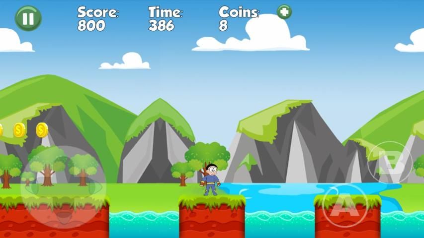 nobita Run dan melompati rintangan dan menghindari lubang, mengumpulkan Poin, Koin