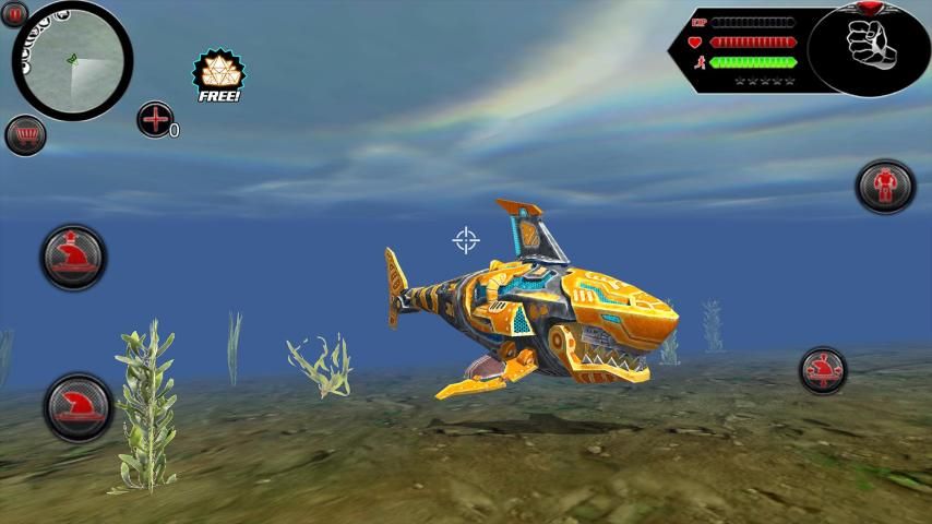 Tunjukkan naluri binatang Anda! Kontrol hiu mekanis, cari harta karun dan serang robot yang bermusuhan. Aksi bajak laut nyata di masa depan!