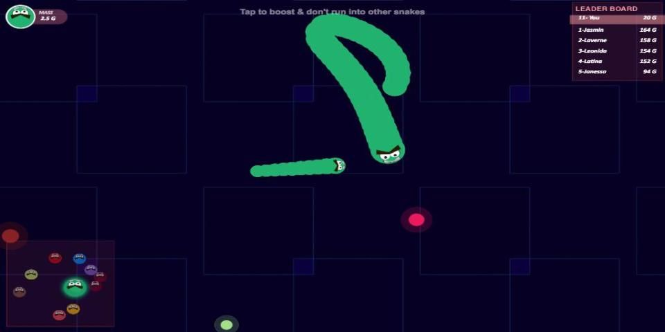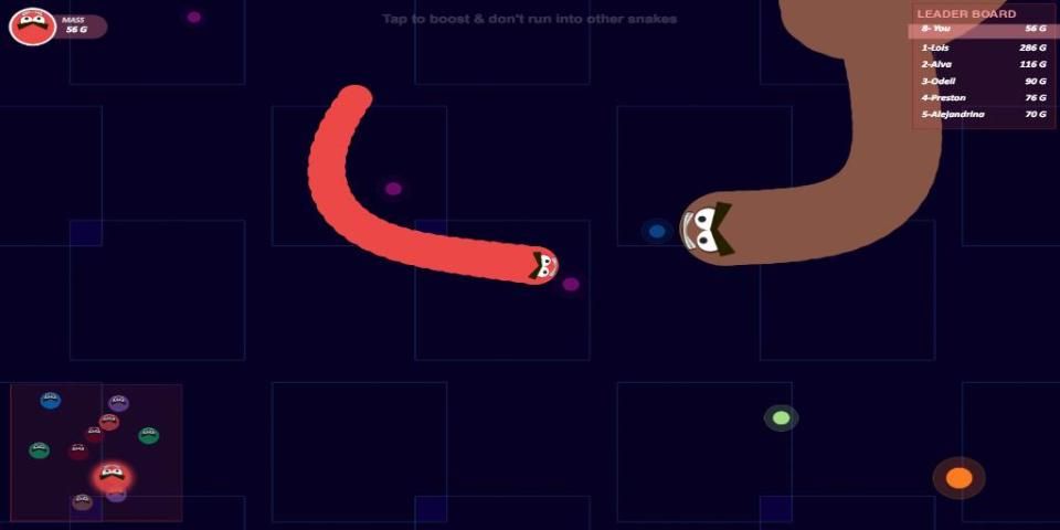 Untuk menghancurkan ular lain Anda harus melintasi jalan mereka dan membuat mereka menabrak Anda - ketika Anda telah menghancurkan musuh, Anda bisa mengumpulkan sisa-sisa mereka dan tumbuh lebih besar. Semakin besar Anda menjadi, semakin mudah untuk mengelilingi musuh Anda dan menghancurkan mereka! Anda juga dapat menggunakan dorongan kecepatan tapi dorongan ini menurun massa dari waktu ke waktu sehingga menggunakannya hemat! Anda bisa menjadi ular pemarah di arena dan mendominasi lawan Anda?