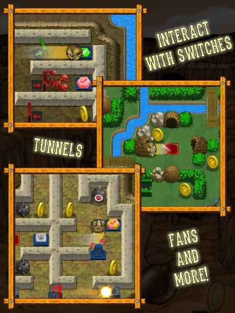 Armadillo Gold Rush has 75+ levels of obstacles, enemies, and traps standing between your armadillo and precious gold. Puzzle out a path that rolls your armadillo over the coins without losing its life. To grab all the gold you’ll need to get clever with bombs, blocks, tunnels, one-way doors, rockets, switches, and most of all your brain!