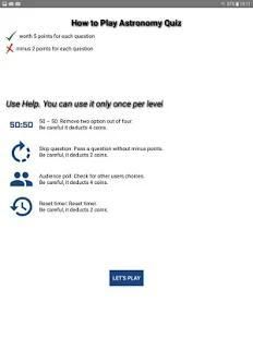 Astronomi Quiz Game menyediakan beberapa alat untuk membantu Anda dalam game seperti 50:50, Loncat pertanyaan, Pemirsa jajak pendapat dan Reset waktu.