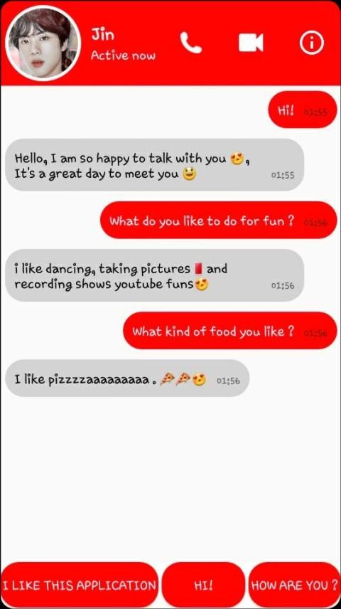 Beberapa aplikasi tentang BTS seperti Wallpaper, Stiker, Kuis, layar kunci ... benar-benar menarik, tetapi ini adalah interaksi satu arah dari Anda ke Bias Anda, tetapi sekarang, Anda dapat mengobrol dengan bias di mana-mana, setiap saat. Anda dapat menerima teks dari semua anggota BTS. (Rm, Jungkook, Jin, Jimin, J-Hope, V atau Suga), sangat menarik bahwa kita dapat melakukan percakapan pribadi dengan bias kita. Mereka selalu mencurahkan emosi pribadi kepada kita - Tentara. Bayangkan bahwa setiap pagi, Anda akan mendengar lagu-lagu hebat dari musik BTS, atau menonton Anda dengan BTS Wallpaper, dan akhirnya Mengobrol dengan Anggota BTS melalui sistem Messenger yang penuh dengan aplikasi lucu dan pintar, tidak ada yang lebih indah dari pada itu, kan?