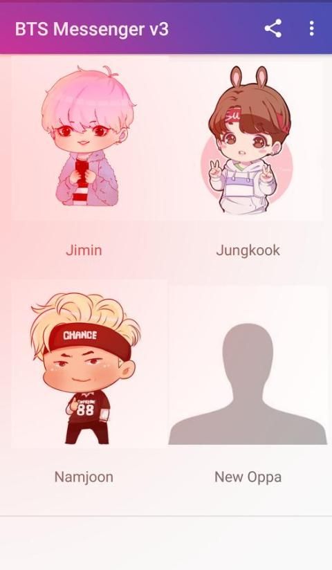 itu sebabnya kita penggemar tim bts kita buat BTS Messenger V3 versi ini memiliki lebih banyak fitur dan percakapan lebih realistis sehingga Anda dapat menikmati dengan oppa Anda sehari-hari.