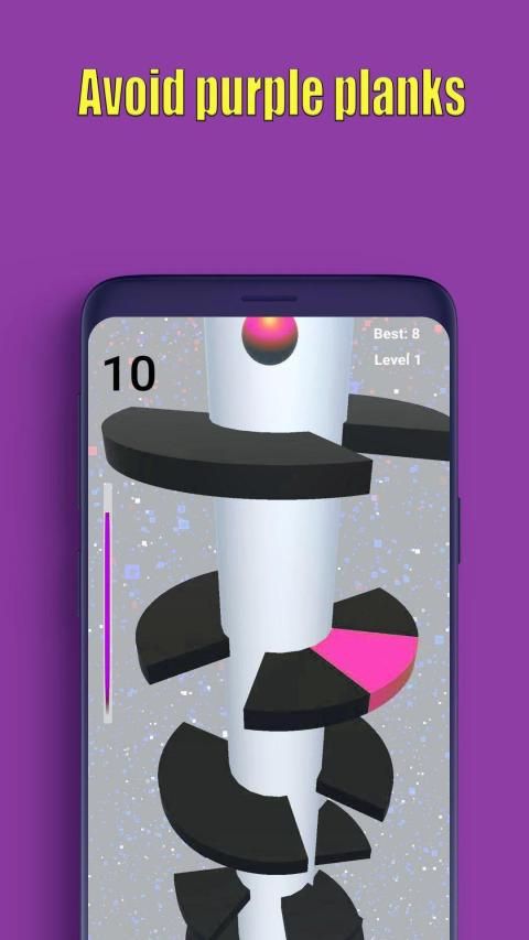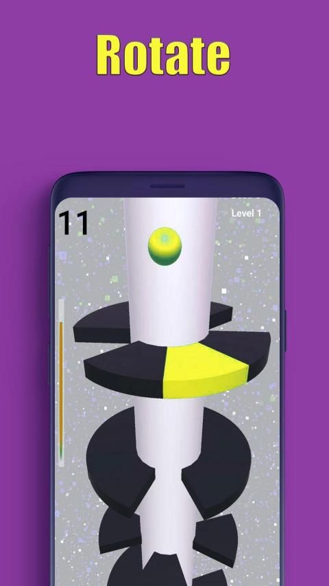 ◉ Putar labirin helix dengan menggeser jari Anda secara horizontal melintasi layar Anda untuk memandu bola melompat melalui celah di menara helix.
