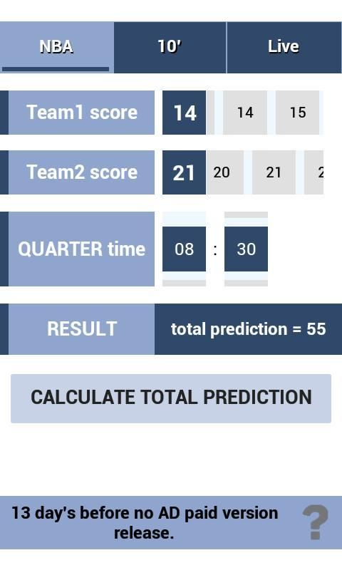 Hidup basket kuartal Total memprediksi. Aplikasi untuk memprediksi total untuk basket kuartal. Pertandingan prediksi basket. Basket kuartal Total prediksi. Perhitungan berdasarkan jaringan saraf. kuartal perkiraan jumlah basket