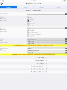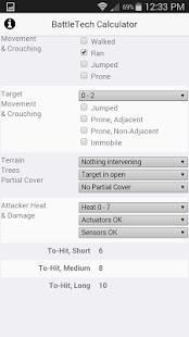 Menjaga permainan BattleTech Anda saat bepergian dengan kalkulator ini berguna. Keluar mengandalkan jari-jari Anda, dan melupakan yang mengatur memiliki apa penyesuaian nomor - hanya memeriksa-off daftar, dan nomor ke-hit Anda berada di bagian bawah.