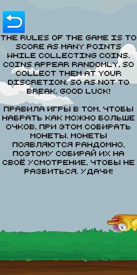 Правила игры заключаются в том, чтобы набрать как можно больше очков и не разбиться, при этом собирая монеты, следует быть внимательным и собирать монеты с умом!
