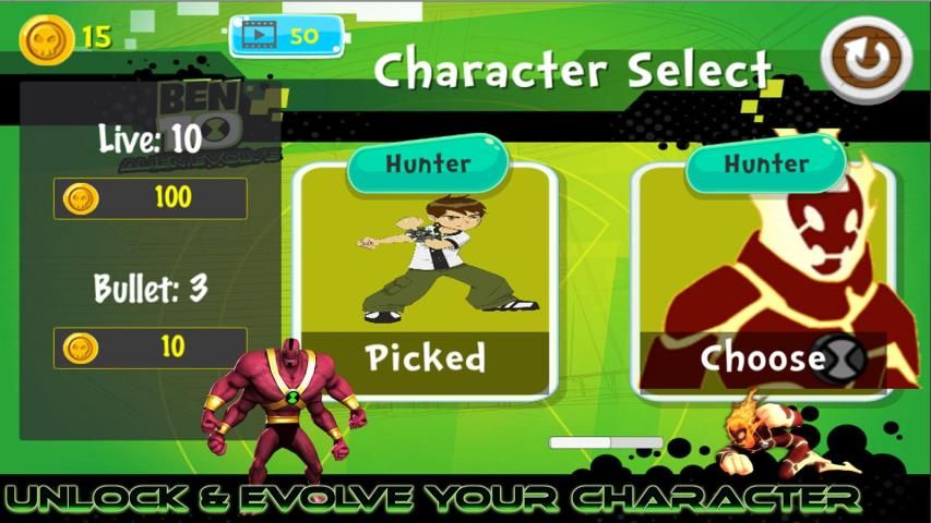 Ben sepuluh pound dapat berkembang sendiri menjadi 10 Aliens Character, dengan 10 Aliens karakter berevolusi mengalahkan musuh dan menyelamatkan dunia!