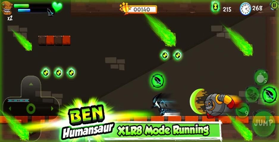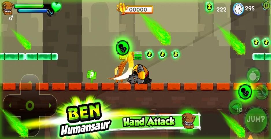 To complete the platformer game Super ben's 10(ten) will jump and run up to speed with superhero ben albedo on many obstacles, fight and shoot against fire fly ninjas, the bats, reboot, ten, humungousaur, skeletons, kevin 11, Sharks, gwen tennysons toys, force omnitrix and Omniverse many other monsters omnitrix force