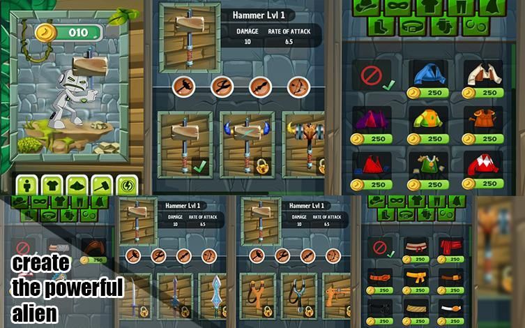 - setelah mengumpulkan lebih banyak koin Anda dapat mencoba untuk menggunakan powerups dan membeli pedang dan palu untuk alien Anda.