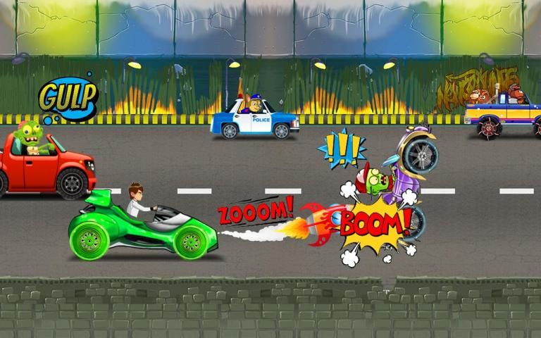 Hal ini gratis dan sangat menyenangkan untuk bermain. Datang membantu Ben ras secepat Anda bisa dan menghancurkan mobil asing dengan mengumpulkan power-up dan menembak ke arah musuh mobil.