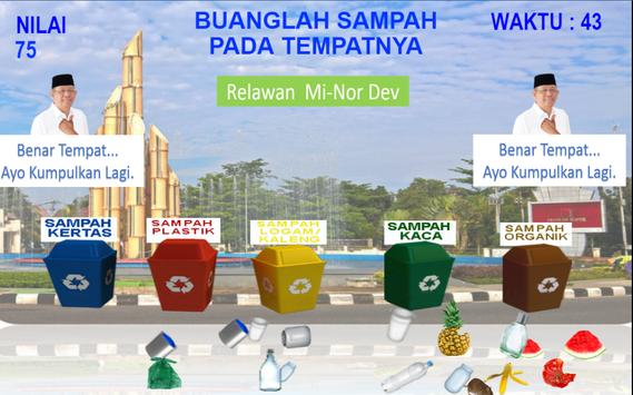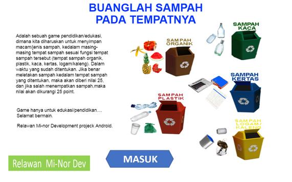 Adalah sebuah game pendidikan/edukasi, dimana kita diharuskan untuk menyimpan macam/jenis sampah, kedalam masing-masing tempat sampah sesuai fungsi tempat sampah tersebut (tempat sampah organik, plastik, kaca, kertas, logam/kaleng). Dalam waktu yang sudah ditentukan. Jika benar meletakan sampah kedalam tempat sampah yang ditentukan, maka akan diberi nilai 25, dan jika salah menempatkan sampah,maka nilai akan dikurangi 25 point.