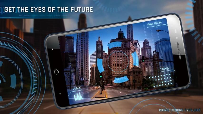 Bionicl Cyborg Robot Eyes Photo Camera Joke over friends. The cyborg simulator has a camera with effects and will allow you to see how the robots are transformers and the age of the face scanner is a simulator!