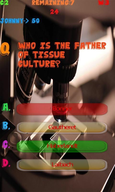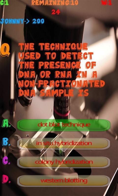This Biotechnology game helps user to sharpening their knowledge and senses, help them to prepare for exams or tests which are based on all branches of Biotechnology and helps them to increase their knowledge. This app targets people of all ages, even children could enjoy tests created by this app and could enhance their Biotechnology Knowledge. This app can be used for the preparation of School, Collage and Universities quizzes and also for entry tests. This app contains cool features like coloring the buttons green if the answer is correct otherwise coloring the button red because the answer is wrong. It provides multi-player functionality which enables you to play against the players around the world. It contains good graphics and less Ads. This app is extremely efficient, it is developed in such a way so that it could run smoothly in any device.