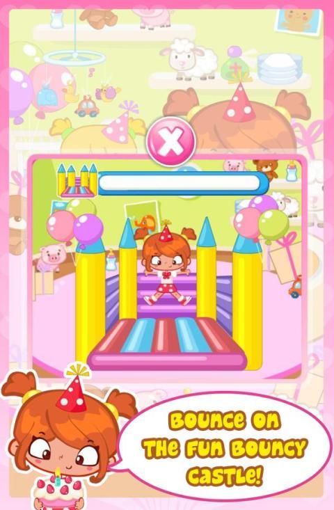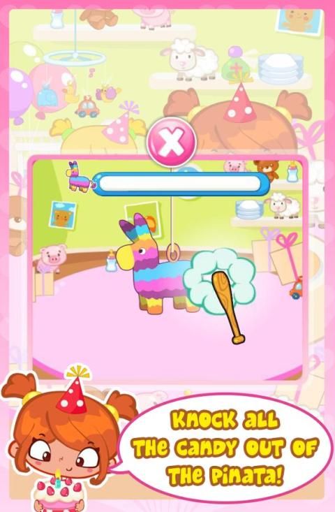 Bermain game menyenangkan pihak di pesta ulang tahun Emma! Memukul pinata untuk mendapatkan semua permen di dalam, pin ekor pada keledai dan bangkit pada goyang istana!