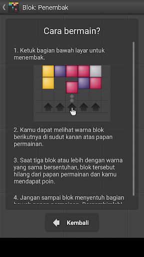 Kamu menembak dengan blok berwarna. Jika ada sedikitnya 3 blok berdekatan dengan warna yang sama, blok itu akan menghilang dan kamu mendapat poin. Sedikit petunjuk untukmu: bidik blok dengan warna yang sama sebagai pelurumu.