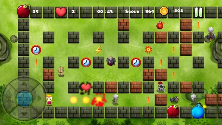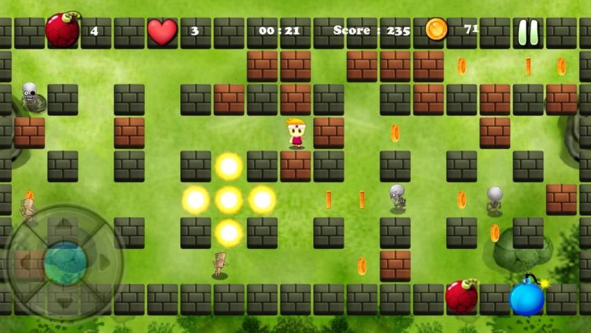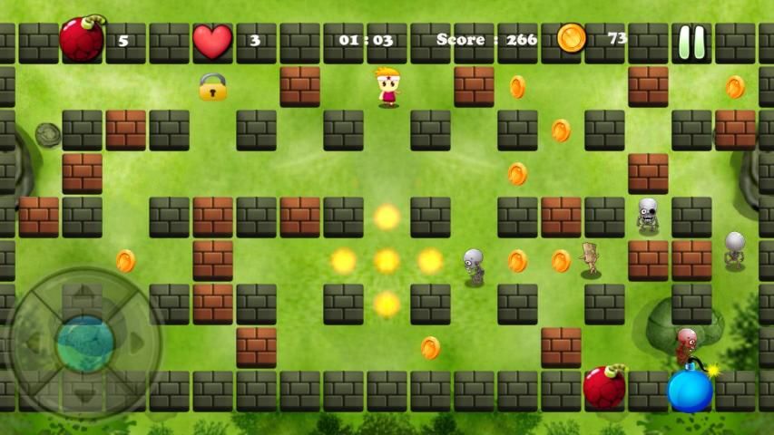 Anda dapat bergerak di sekitar layar melalui joystick virtual dan menaruh bom dengan menekan Bomb Button.In permainan lucu dan adiktif