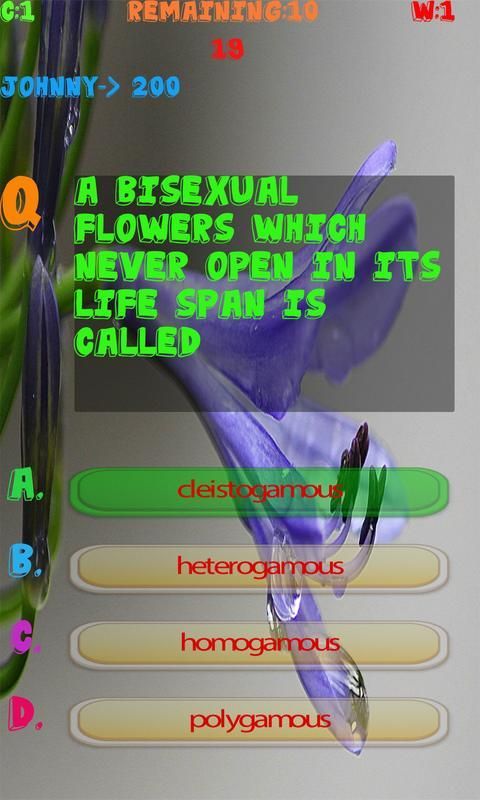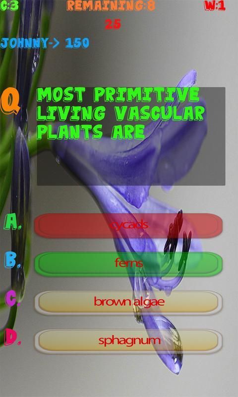 This Botany game helps user to sharpening their knowledge and senses, help them to prepare for exams or tests which are based on all branches of Botany and helps them to increase their knowledge. This app targets people of all ages, even children could enjoy tests created by this app and could enhance their Botany Knowledge. This app can be used for the preparation of School, Collage and Universities quizzes and also for entry tests. This app contains cool features like coloring the buttons green if the answer is correct otherwise coloring the button red because the answer is wrong. It provides multi-player functionality which enables you to play against the players around the world. It contains good graphics and less Ads. This app is extremely efficient, it is developed in such a way so that it could run smoothly in any device.