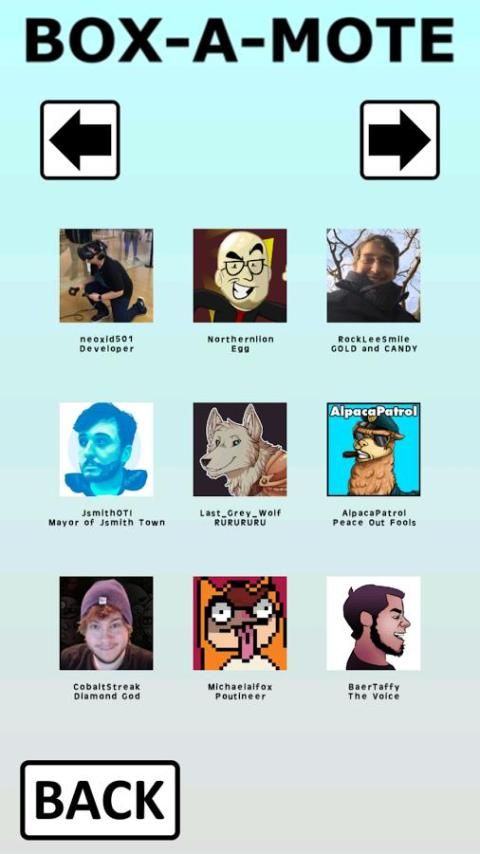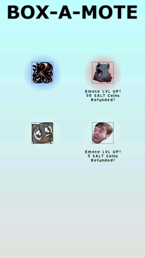 Kumpulkan semua Emotes! Lakukan saja! Ada banyak dari mereka dan mereka datang dari segala macam orang lucu termasuk telur, orang emas, dan meme bahkan hidup. Kotak-A-Mote dimaksudkan untuk menjadi satir dan berisi referensi bahwa khalayak umum mungkin tidak mengerti.
