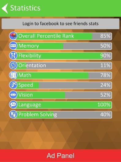 The 8 categories are Flexibility, Language, Math, Memory, Vision, Orientation, Speed and ProblemSolving.