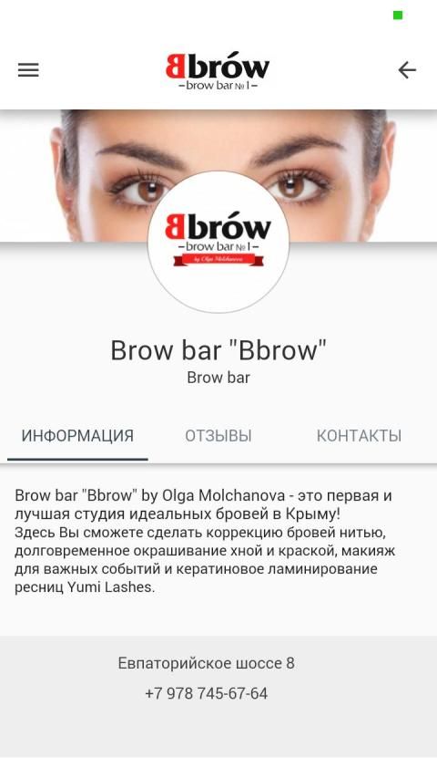 Приложение Online - записи в Brow Bar "Bbrow" г.Симферополь. Brow bar "Bbrow" by Olga Molchanova - это первая и лучшая студия идеальных бровей в Крыму! Здесь Вы сможете сделать коррекцию бровей нитью, долговременное окрашивание хной и краской, макияж для важных событий и кератиновое ламинирование ресниц Yumi Lashes. Данное приложение поможет Вам с легкостью записаться на услуги в нашу студию.