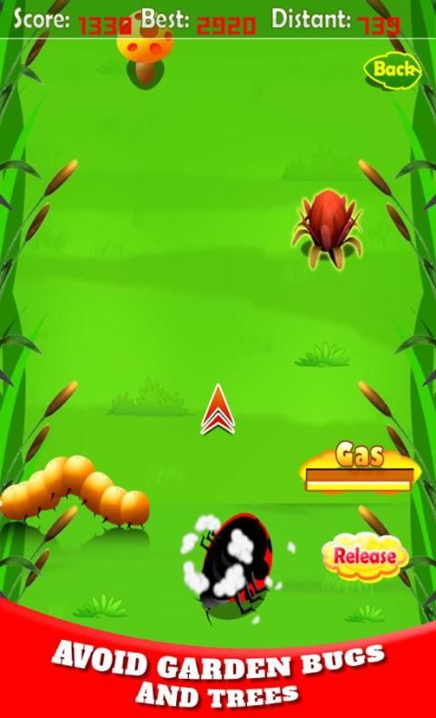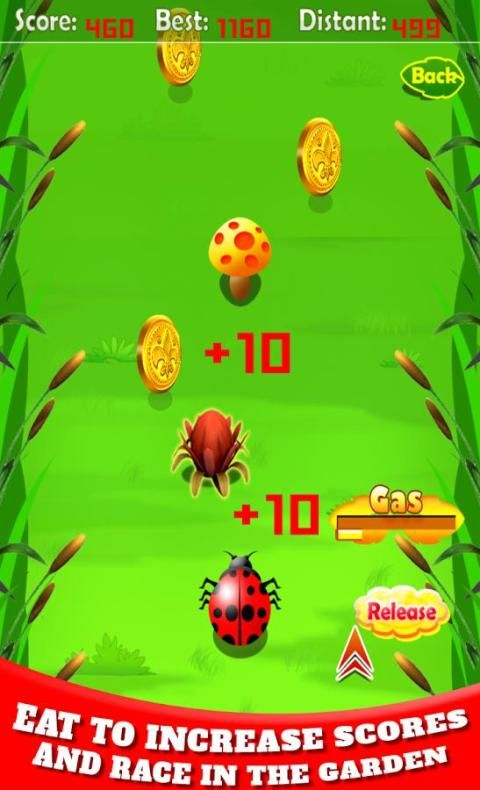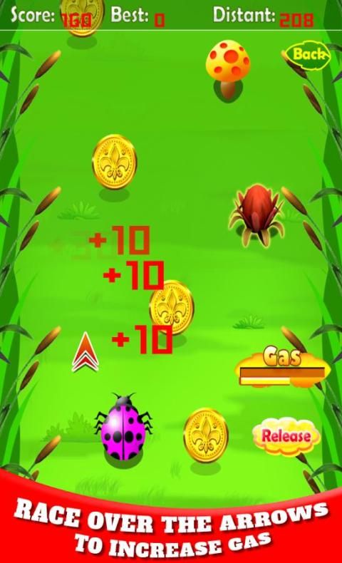 Bug Racing is an amazing fun and addictive beetle bug racing game. Collect the coins, eat the mushrooms, plants and avoid other garden bugs and trees. Survive the garden and escape from the garden. Collect the arrows to increase the gas, release the gas in case if you are out of fuel. Have a look at the cool features and easy controls.