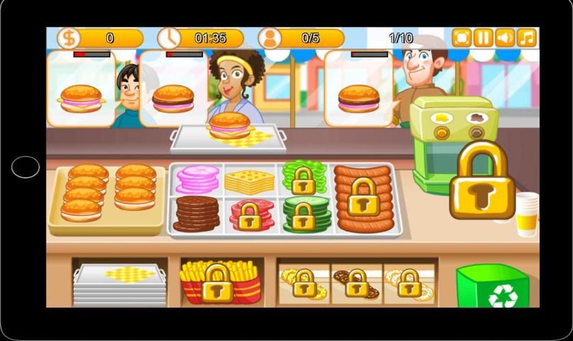 Ketuk di piring dan memastikan Anda memindahkan ingedients benar tepat pada sandwich dan burger. Tekan pada hamburger untuk menyampaikan permintaan dan jangan lupa untuk mengumpulkan uang.