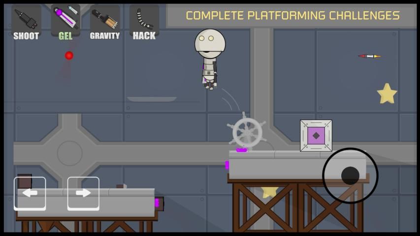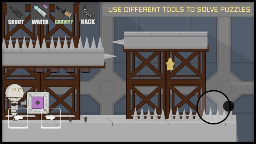 This indie game features classic puzzle platformer gameplay. In every side-scroller level of the indie game you'll have to leap over death traps, obstacles or leap across gaps. Physics platforming is a big part of the game. Also, you can find three stars (collectables) in every level. Use your robot tools to avoid traps and dangerous gaps in order to collect them all and finish the game!