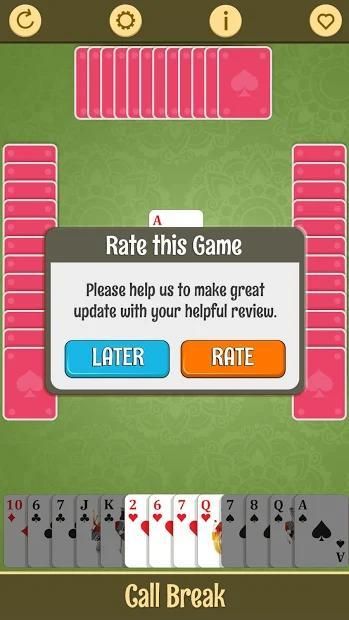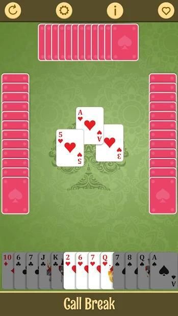 Panggilan mematahkan permainan kartu klasik gratis adalah permainan kartu adiktif dan populer trik, mengalahkan dan penawaran yang populer di India, Bangladesh dan Nepal. Panggilan istirahat tampaknya terkait dengan permainan Amerika Utara Spades dan Asia permainan kartu panggilan permainan bridge.This permainan - Call break dimainkan menggunakan paket 52-kartu standar internasional. Kartu dari masing-masing sesuai peringkat dari tinggi ke rendah A-K-Q-J-10-9-8-7-6-5-4-3-2. Spades adalah mengalahkan permanen: kartu dari jenis yang Spade mengalahkan kartu dari setiap suit.Deal lain dan bermain yang counter-clockwise.To berhasil Panggil istirahat, seorang pemain harus memenangkan sejumlah trik yang disebut, atau lebih trik dari panggilan. Jika seorang pemain berhasil, jumlah yang disebut ditambahkan ke nilai kumulatif nya. Jika tidak jumlah yang disebut dikurangi.