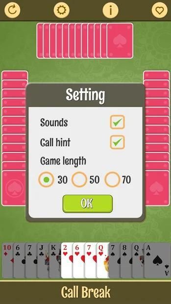 Call break classic card game free is a addictive and popular card game of tricks, trumps and bidding which is popular in India,Bangladesh and Nepal. Call break seems to be related to the North American game Spades and asian card game game call bridge.This game - Call break is played using a standard international 52-card pack. The cards of each suit rank from high to low A-K-Q-J-10-9-8-7-6-5-4-3-2. Spades are permanent trumps: any card of the Spade suit beats any card of any other suit.Deal and play are counter-clockwise.To succeed in Call break, a player must win the number of tricks called, or more trick than the call. If a player succeeds, the number called is added to his or her cumulative score. Otherwise the number called is subtracted.
